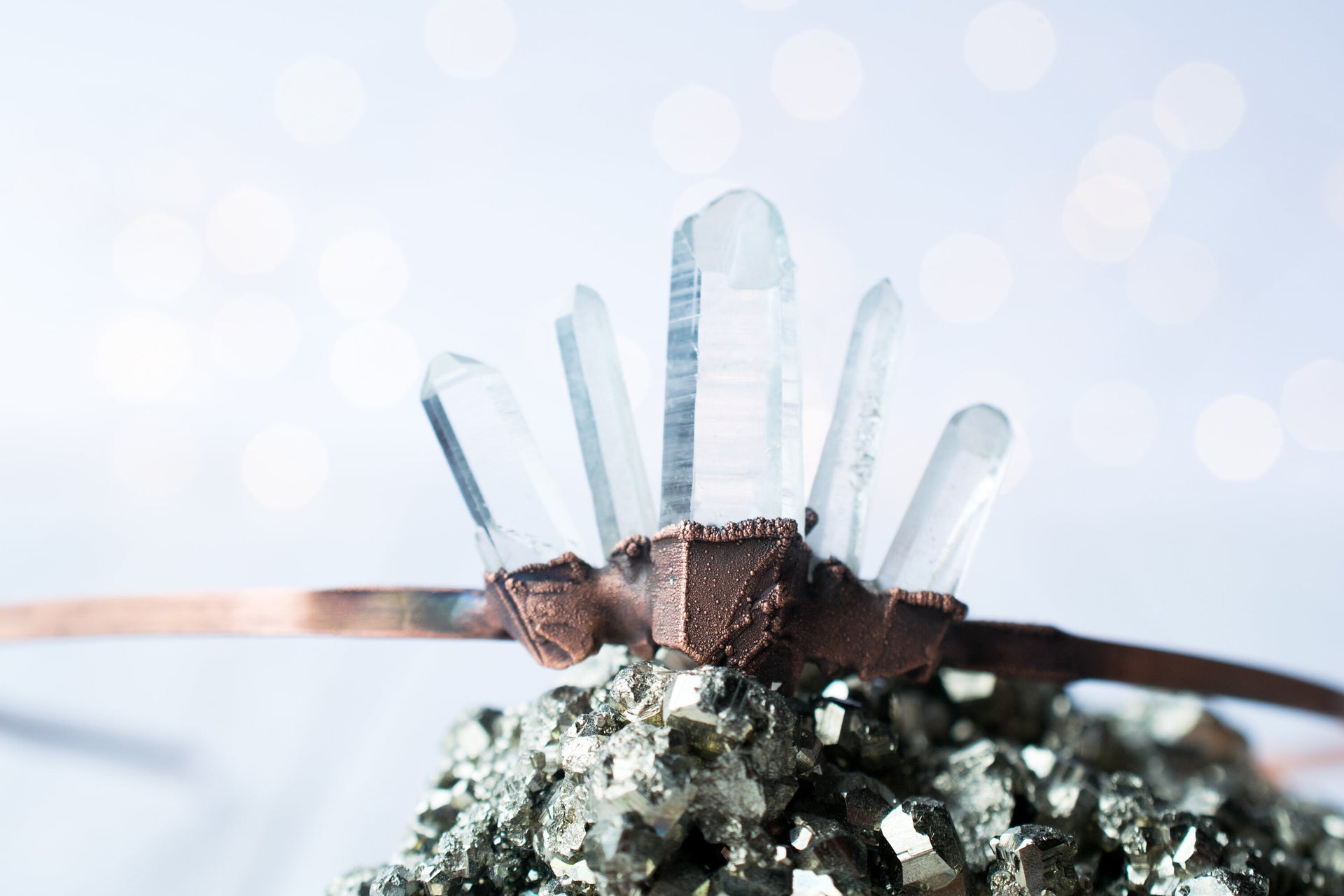Five graduated quartz crystals have been electroformed to a copper headband, creating this one-of-a-kind crystal tiara.