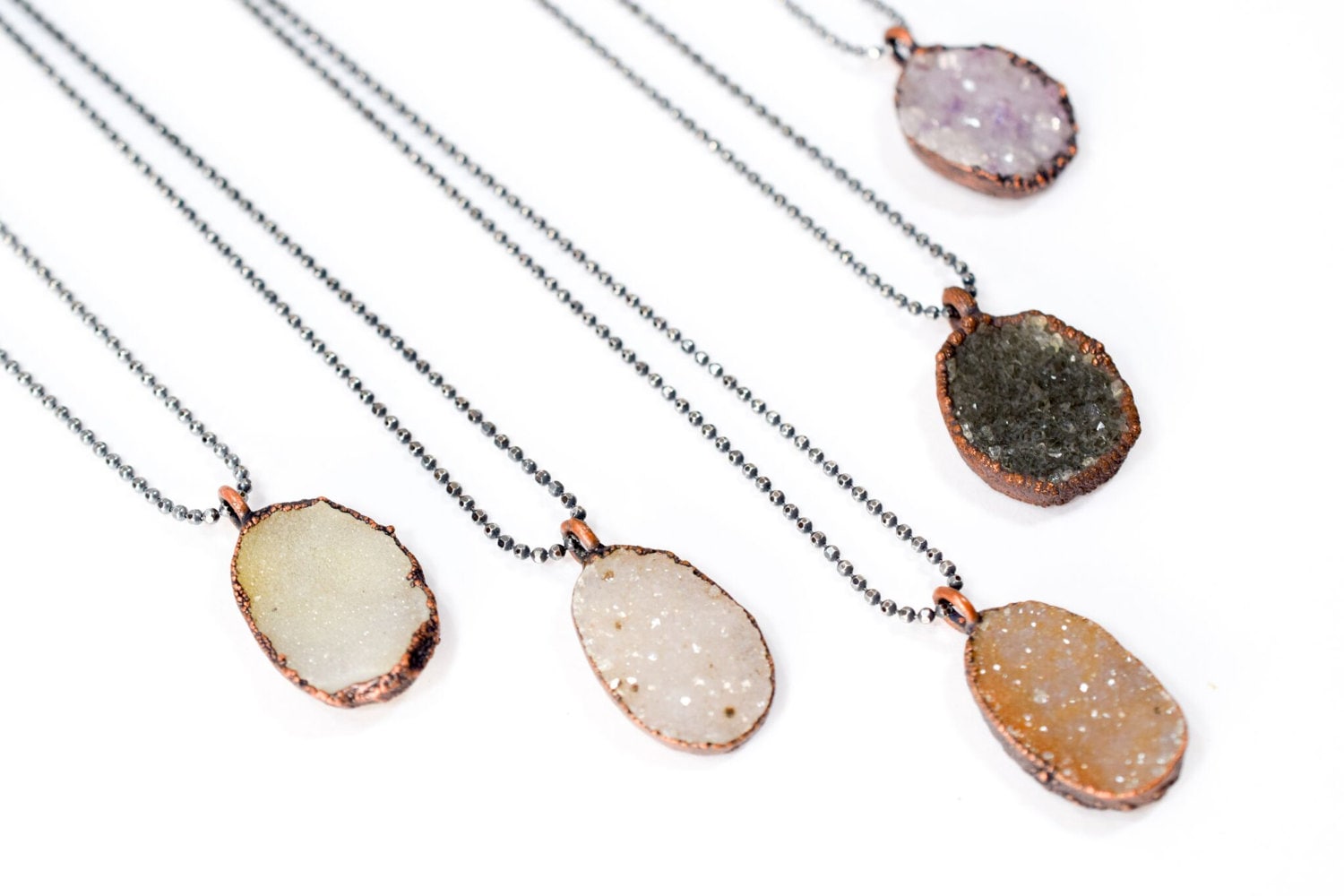 This listing is for one slice of undyed druzy eletroformed and strung on an 18" sterling silver ball chain.