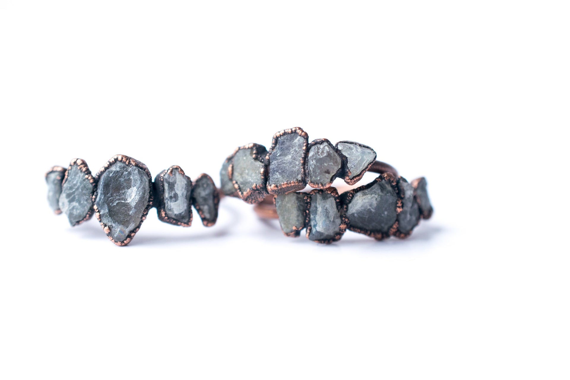 This listing is for five graduated raw labradorite crystals electroformed to a hand-hammered 16 gauge recycled copper ring.