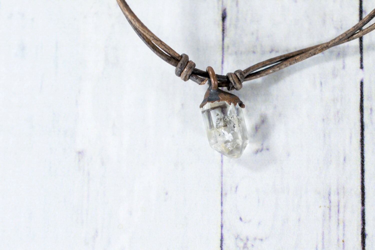 This listing is for one raw crystal electroformed and strung on dark brown or black leather cord, adjustable from 16"-24".