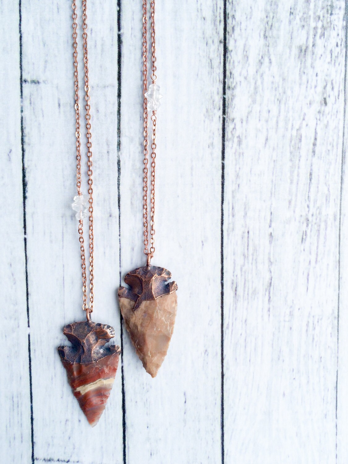 This listing is for one arrowhead fossil electroformed and strung on a 30" chain with three crystals.