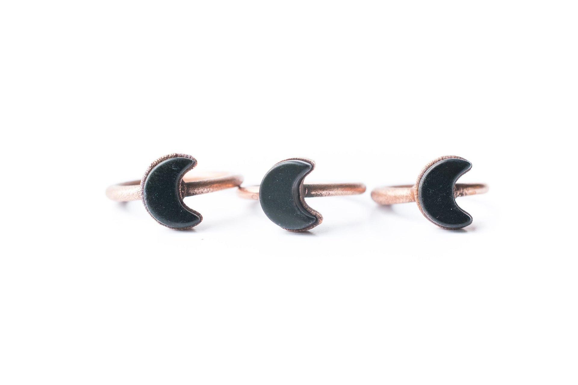 This listing is for one tumbled black obsidian moon crystal electroformed to a hand-hammered 12 gauge recycled copper ring. Moons are approximately 10mm.