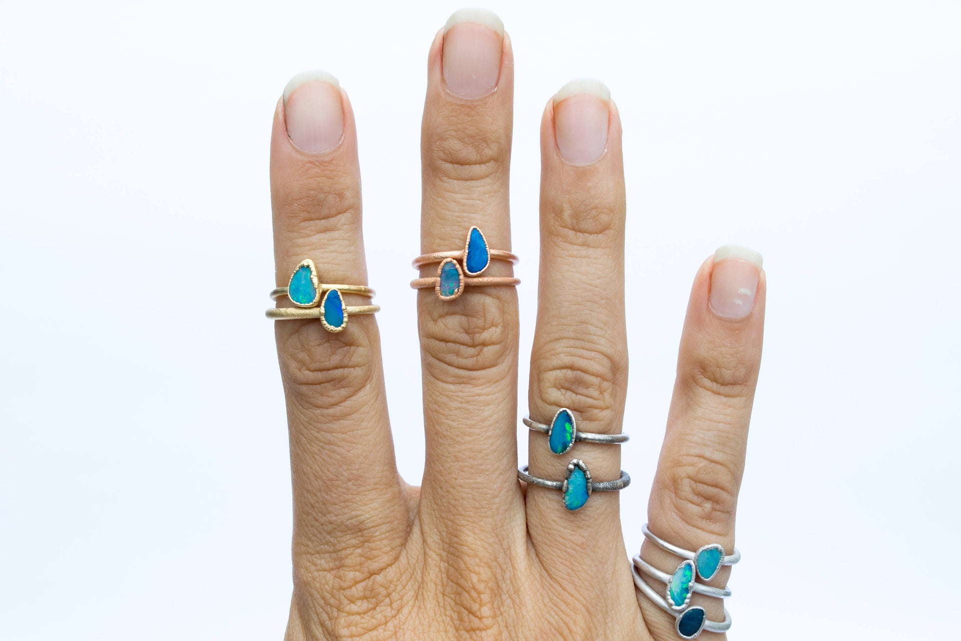 This listing is for one small irregularly shaped Australian opal doublet electroformed to a hand-hammered 16 gauge recycled copper ring plated in silver, oxidized silver, gold or rose gold.