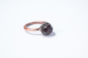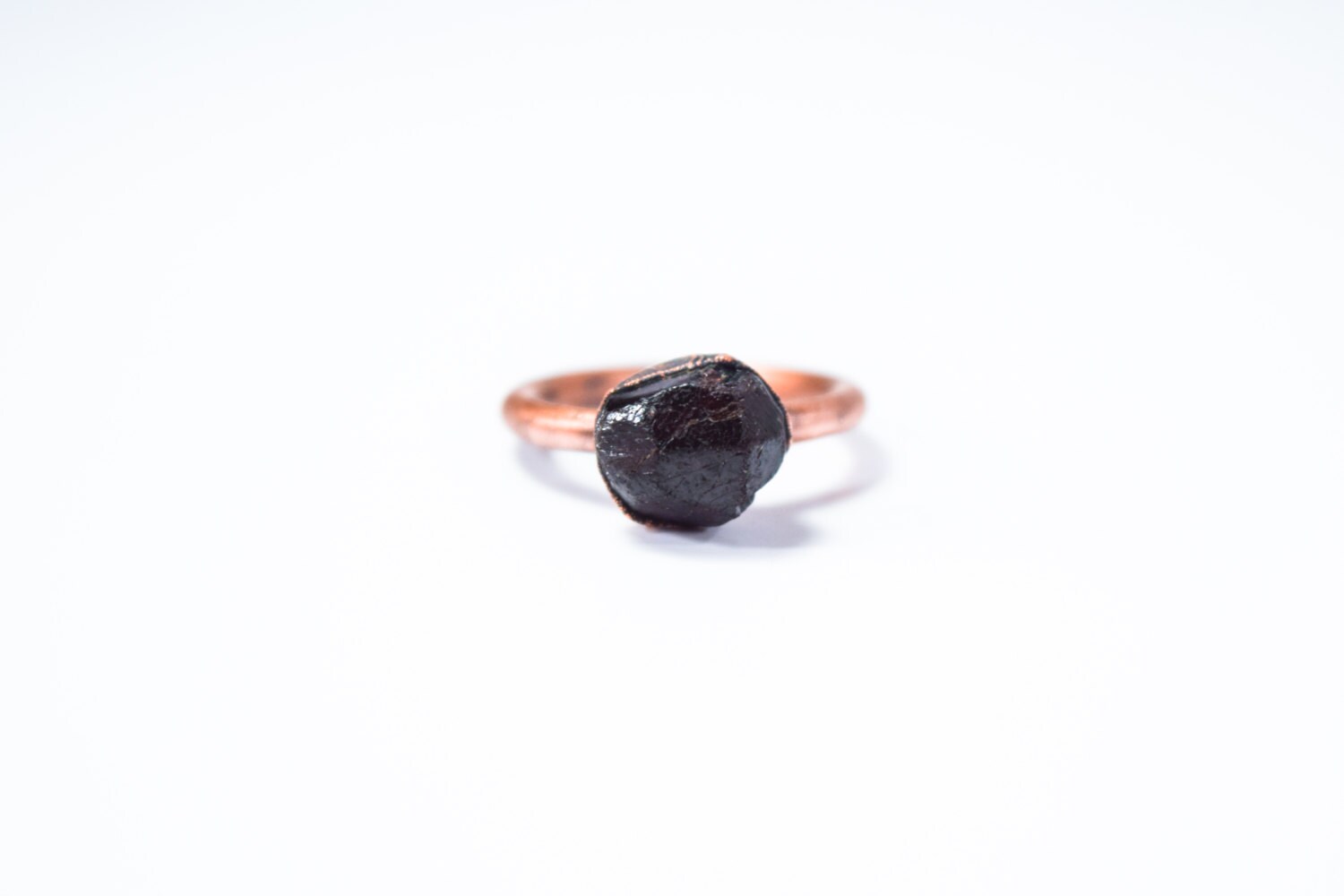 This listing is for one raw red garnet crystal electroformed to a hand-hammered 12 gauge recycled copper ring.