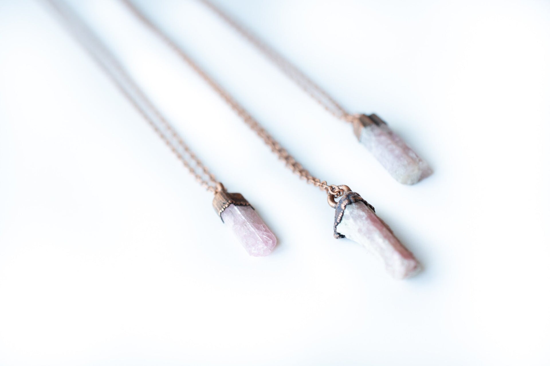 This listing is for one raw pink tourmaline crystal electroformed and strung on an 18" copper cable chain.